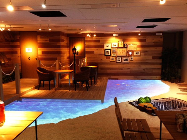 オフィスに出現した海辺 東京都渋谷に本社を置き、インターネットサービス事業を行う株式会社ビズリーチ。その本社オフィスの一角に「海辺」をつくりました!「海辺?オフィスに?」と思われるかもしれませんが、水は一切使わず、3台のプロジェクタと映像技術によってオフィスビーチを実現しています。また、タップトークシステムにより、人が入り込むと波紋が広がるインタラクティブ映像となっています。真夏ようなバーチャルビーチサイドで、数々の商談や打ち合わせが行われています! ●技術ポイント