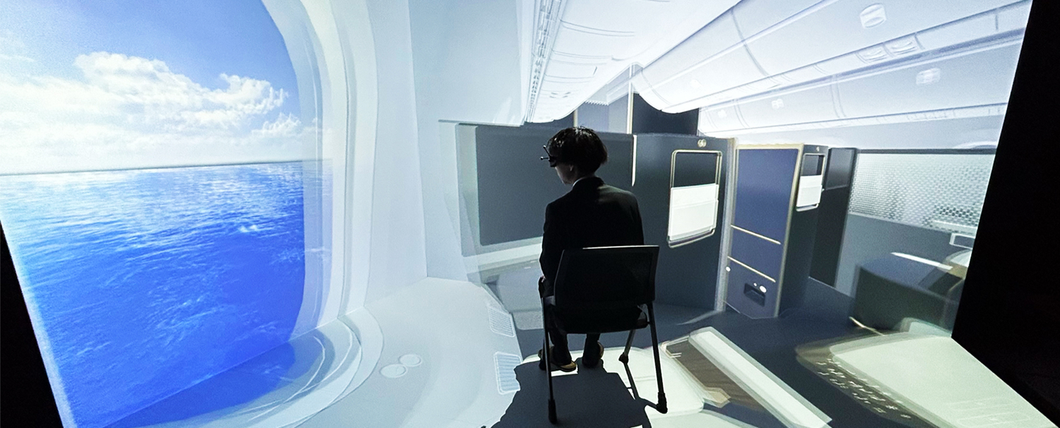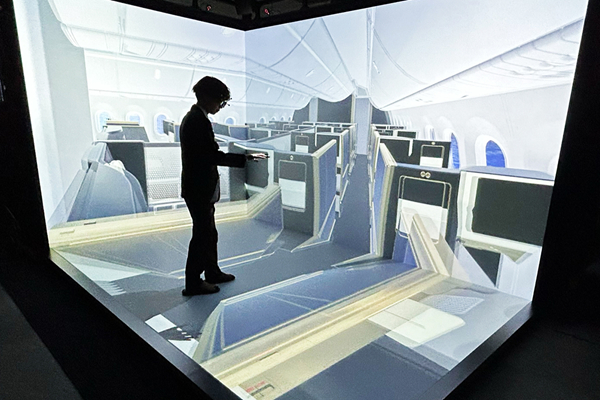 本システムにより、座席シートや化粧室、厨房設備などを航空機内に配置し、実寸大で体感し検証することができます。
